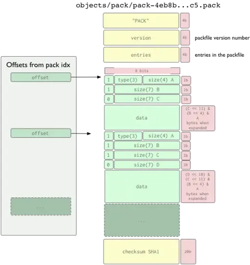 • Body 部分主要是一个个 Git 对象依次存储,存储位置在 idx 索引文件中记录改对象在 pack 文件中的偏移量 offset。