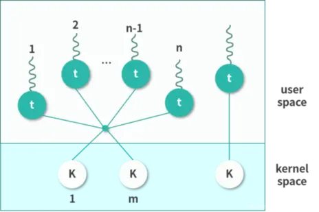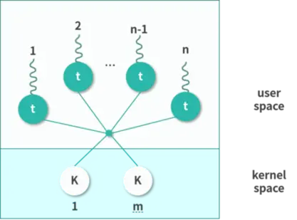 该模型为每个用户态的线程分配一个单独的内核态线程,在这种情况下,每个用户态都需要通过系统调用创建一个绑定的内核线程,并附加在上面执行。 这种模型允许所有线程并发执行,能够充分利用多核优势,Windows NT 内核采取的就是这种模型。但是因为线程较多,对内核调度的压力会明显增加。