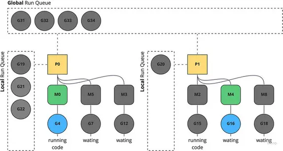 - M:线程想运行任务就得获取P,从P的本地队列获取G,P队列为空时,M也会尝试从全局队列拿一批G放到P的本地队列,或从其他P的本地队列偷一半放到自己P的本地队列。M运行G,G执行之后,M会从P获取下一个G,不断重复下去。