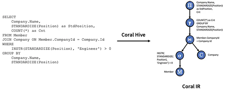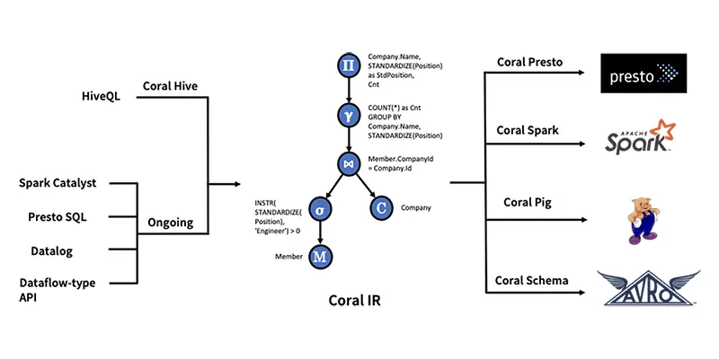 • 视图转换和重写: 将 Coral IR 重写为适合目标引擎(例如 Presto、Spark、Pig)的表示形式的过程,以便引擎可以使用其自己的方言和UDF查询.