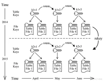 图6显示了单个表秘钥的生命周期。假设每个月轮换一次秘钥,每年重新设置一次数据秘钥。表文件1和表文件2是在2014年4月创建的,使用键1版本1(k1v1)。2014年5月,将key1旋转为版本2(k1v2),并使用k1v2创建表文件3。2014年6月,key1被旋转到版本3(k1v3),并创建了另外两个表文件。2014年6月之后,不再对表进行插入或更新。2015年4月,k1v1已满一年,需要销毁。将创建一个新密钥,即密钥2版本1(k2v1),并使用k2v1重新设置与k1v1关联的所有文件的密钥。2015年5月,k1v2也发生了同样的情况,表文件3使用k2v2重新键入。2015年6月,表文件4和表文件5使用k2v3重新设置了密钥。